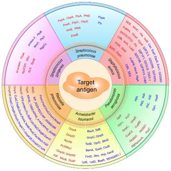Summary of known target antigens (highlighted in red) used for designing epitope-based vaccines against S. aureus, S. pneumoniae, S. pyogenes, K. pneumoniae, A. baumannii, and P. aeruginosa. Target antigens in red indicate those with known immunogenicity and/or protective effects in animal models. Target antigens in blue indicate those predicted using bioinformatics tools but lacking in vitro and in vivo experimental validation.