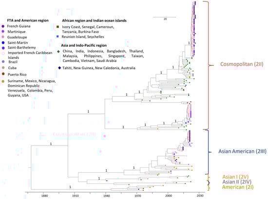 Bayesian phylogeny of DENV2 whole-genome sequences. Detailed on Asian American genotype. The maximum clade credibility (MCC) tree, using the GTR + G + I (General Time Reversible with Gamma distribution and Invariant sites) substitution model, was constructed with a strict clock model and Bayesian skyline prior.