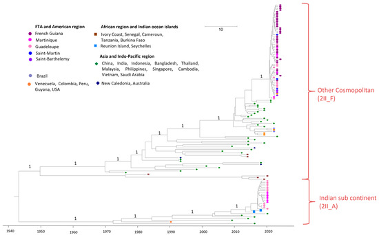 Interestingly, at the same time (2019–2020), strains circulating in Martinique and Guadeloupe (2019–2020 epidemic) belong to another genotype (Cosmopolitan genotype, Indian sub-continent lineage), as shown in Figure 3. The sequences of this monophyletic clade are distributed according to their origin (MTQ or GLP) and share between 99.60 and 99.96% nucleotide identity with each other and 99.55 and 99.72% nucleotide identity with MN272404 Reunion Island 2018. The MRCA between MN272404 Reunion Island 2018 and this clade dates to 2015 (95% HPD 2014–2017), Figure 3. The Reunion Island strain was imported from the Seychelles [27]. Asian strains, notably Indian strains, are at the origin of this clade.