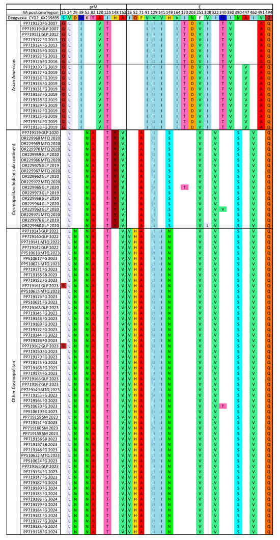 Moreover, some amino acid changes specific to one or more genotypes and subgenotypes are common to both analyses (Dengvaxia and Qdenga vaccine strains) in the prM (8 common amino acid changes) and E (18 common amino acid changes) regions, as shown in Table 2 and Figure 4, Figure 5 and Supplementary Figure S1.