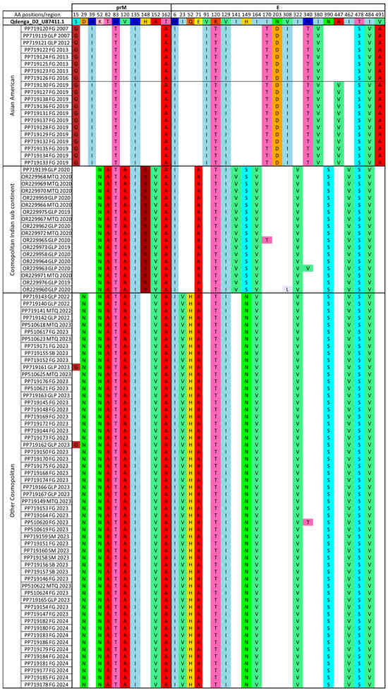 Analysis of amino acid changes between our dataset compared to the Qdenga vaccine strain (U87411) showed 46 AA positions with AA substitutions along the prM and E regions with, respectively, 16 and 30 AA changes, as shown in Supplementary Data Table S2. Looking more specifically at the AA substitution specific to one or more genotypes and subgenotypes (Asian American, Cosmopolitan Indian sub-continent, and Cosmopolitan Other Cosmopolitan) compared to the Qdenga vaccine strain, we observed 32 amino acid changes with 11 in the prM (ratio of 6.62%) and 21 in the E (ratio of 4.24%), as shown in Figure 5 and Supplementary Data Table S2. Some AA substitutions are even shared between all genotypes as for the Asian American genotype (n = 17) and for the Cosmopolitan genotype (n = 21), as shown in Figure 5. Within this Cosmopolitan genotype, the Cosmopolitan Indian subcontinent shows 20 shared AA changes, while the Other Cosmopolitan subgenotype shows 21, as shown in Figure 5. Some are shared by all genotypes (n = 8), as shown in Figure 5. It is therefore possible to define genotype-specific substitution profiles.
