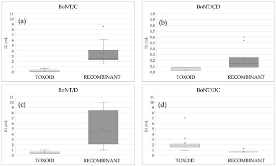 Neutralizing antibody titers against BoNT/C (a), BoNT/CD (b), BoNT/D (c), and BoNT/DC (d): comparison between traditional toxoid vaccine and recombinant vaccine 21 days after the second vaccination. (X = mean value; • = outlier value).