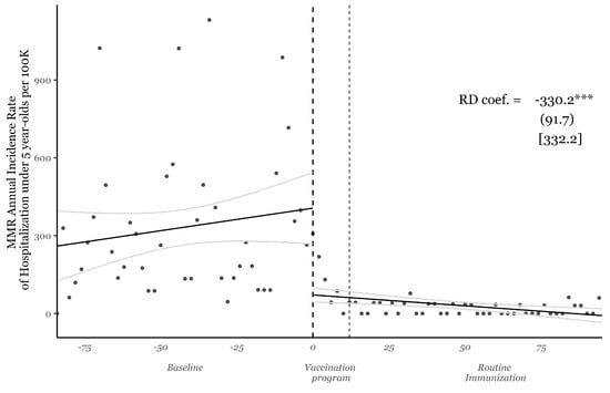We also fit linear trend lines for the 75 months before and after the vaccination campaign and provide a regression discontinuity estimate to quantify the sudden drop in hospitalization incidence due to the massive and successful immunization effort. Formally, we estimate the following regression: