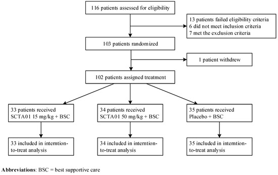 This study was from 27 March to 29 December 2021, and 116 patients were screened across 11 investigational centers in five countries: the United States of America, Argentina, Brazil, Chile, and Peru. Finally, 103 hospitalized patients with severe COVID-19 were randomly assigned in a 1:1:1 ratio to receive SCTA01 15 mg/kg (n = 33), SCTA01 50 mg/kg (n = 34), or a placebo (n = 35). Among these patients, 56 (54.9%) were seropositive, 36 (35.3%) were seronegative, and the serostatus was unknown for 10 (9.8%) at baseline. All patients received the best supportive treatment, including corticosteroids (primarily dexamethasone), remdesivir, or other COVID-19 drug therapy. The analysis population consisted of only 102 patients, as one patient withdrew (Figure 1).