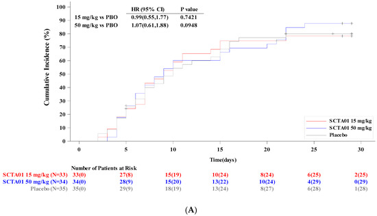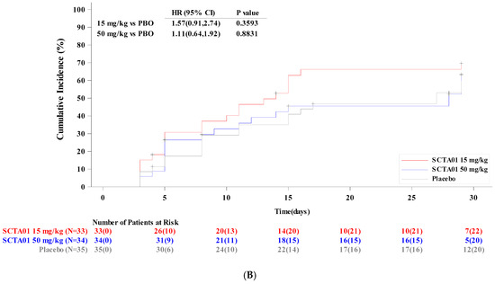 The median time to clinical improvement for all patients was numerically shorter but statistically non-significant, at 9.0 days for both SCTA01 groups and 10 days for the placebo (Table 2). No significant difference in time to clinical improvement was observed in the treatment groups and placebo: SCTA01 15 mg/kg vs. placebo, HR 0.99, 95% CI 0.55–1.77, p = 0.742; SCTA01 50 mg/kg vs. placebo, HR 1.07, 95% CI 0.61–1.88, p = 0.095 (Figure 2A). The cumulative incidence of patients who achieved score 1 (not hospitalized) on Day 29 was 26 (78.8%), 25 (73.5%), and 24 (68.6%) in SCTA01 15 mg/kg, SCTA01 50 mg/kg, and placebo, respectively. The entire distribution of patients on the 8-point scale, for which complete data are available for all patients, is shown in (Figure S1).