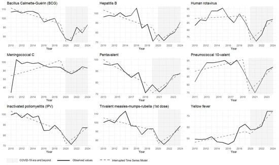 In our study, the analysis period covered the years from 2010 to 2024, except for the meningococcal C conjugate and pneumococcal vaccines, which were analyzed from 2011, and the pentavalent vaccine, from 2013, due to the lack of previous data. For the year 2024, data refer to the period up to October, the last available month at the time of data extraction for this study in January 2025. The pre-pandemic period (2010–2019) served as the baseline, while the pandemic and post-pandemic period (2020–2024) was used to assess potential changes in vaccination coverage.