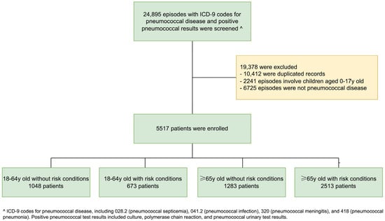 Based on a previously published cohort of patients with pneumococcal infection who required hospitalization, 5517 patients were enrolled, which included 1084 (19.6%) patients aged 18–64 years without risk conditions, 673 (12.2%) patients aged 18–64 years with risk conditions, 1283 patients (23.3%) aged ≥65 years without any risk conditions, and 2513 (45.6%) patients aged ≥65 years with risk conditions (Figure 1) [24].