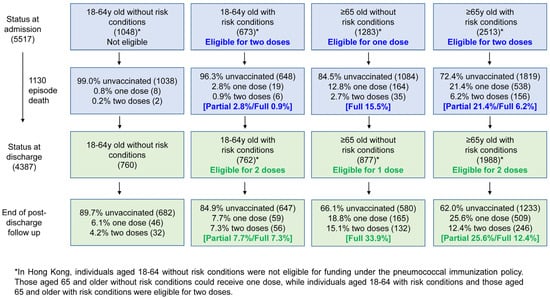 In Hong Kong, the Scientific Committee on Vaccine Preventable Diseases regularly issues recommendations regarding the use of pneumococcal vaccines [18]. Adults aged 18–64 years and ≥65 years with high-risk conditions are recommended to receive two doses of pneumococcal vaccines [18]. Currently, this consists of one dose of PCV15, followed by one dose of 23vPPV one year later. For those aged ≥65 years without high-risk conditions, one dose of 23vPPV is recommended. Adults aged 19 to 64 years without high-risk conditions are not eligible for pneumococcal vaccination. Patients were considered to be eligible when there was an age-based or risk-based vaccine indication. High-risk conditions that qualified for pneumococcal vaccination, including history of invasive pneumococcal disease, chronic cardiovascular diseases (including myocardial infarction, heart failure), chronic lung disease (including chronic obstructive pulmonary disease), chronic liver disease (including liver cirrhosis and liver failure), chronic kidney disease, diabetes mellitus, immunocompromised states (including malignancy, human immunodeficiency virus infection), and chronic neurological conditions (including hemiplegia and previous stroke), were collected for analysis. During the study period, only PCV13, PCV15, and 23vPPV were available. To assess pneumococcal vaccination prior to developing pneumococcal infection, the time period for immunization documentation was extended from January 2005 to August 2024 to cover a minimum 10-year period prior to development.