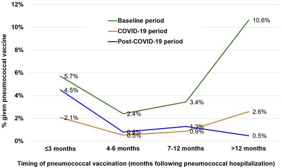 Our data showed that the administration of pneumococcal vaccination to patients post-discharge decreased during the COVID-19 pandemic. Despite a rebound in the initial two years post-COVID-19, the vaccination rates were still lower than those in the baseline period. In a telephone survey of community-living adults aged ≥65 years in Hong Kong, the self-reported uptake rate of pneumococcal vaccine was found to increase during and after the COVID-19 pandemic, indicating that there was a change in health-seeking behavior. Disruption of healthcare services, especially the overloading of public hospital services during COVID-19, may explain these findings [31,40].