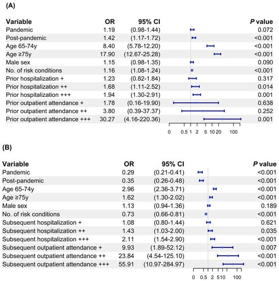 Conversely, the pandemic period (OR 0.29), the post-pandemic period (OR 0.35), and an increased number of risk conditions (OR 0.73) were significantly associated with lower pneumococcal vaccination uptake post-hospitalization (Figure 4B). On the other hand, a higher pneumococcal vaccination uptake was associated with older ages (65–74 years, OR 2.96; ≥75 years, OR 1.62), subsequent hospitalization for 5–10 times (OR 1.43) and ≥10 times (OR 2.11), and subsequent clinic attendance (1–5 times, OR 9.93; 5–10 times, OR 23.84; ≥10 times, OR 55.91).