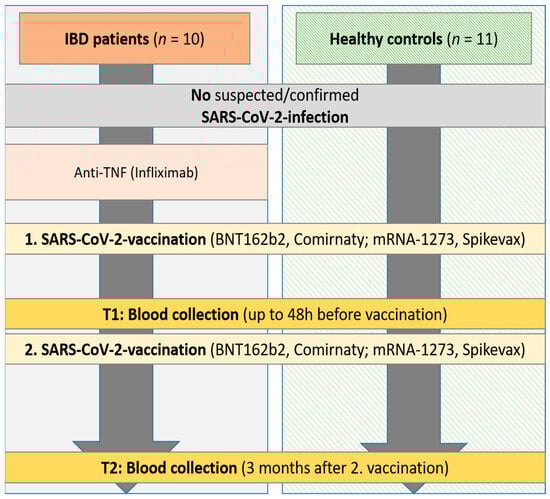 Samples from IBD patients (n = 10) and matched healthy control persons (n = 11) without suspected or confirmed SARS-CoV-2 infection were collected at the IBD outpatient clinic of the Department of Gastroenterology, Hepatology, Endocrinology, and Clinical Infectiology, University Hospital Muenster, Germany, in the framework of a prospective study (January 2021–November 2021) [19]. The IBD patients included in this study received immunosuppressive therapy with anti-TNF antibodies (i.e., infliximab) for at least three months before undergoing their first mRNA immunization. In the IBD patients diagnosed with ulcerative colitis, the clinical Mayo score was determined at the time of blood collection, whereas in the Crohn’s disease patients, the Crohn’s disease activity index (CDAI score) was determined in each case. The vaccination of the study groups was performed with either BNT162b2 (Comirnaty, BioNTech SE/Pfizer, Mainz, Germany) or mRNA-1273 (Spikevax, Moderna Inc., Cambridge, MA, USA), both of which are monovalent, non-variant of concern (VOC) adapted mRNA vaccines. Patients were vaccinated solely according to their physicians’ recommendation, not for study purposes. The first blood sample was taken up to 48 h before the second vaccination (t1; Figure 1). Follow-up blood samples were taken three months (±7 days) after the second mRNA-based SARS-CoV-2 vaccination (t2). In IBD patients, samples of all participants were obtained at t1 and t2. In the control group, samples were collected from nine participants at time points t1 and t2. However, due to the lack of a tenth control having donated specimens at t1 and t2, samples were instead collected from two participants once at each of these time points, respectively. The local ethical committee (University Hospital Muenster 2021-039-f-S, 3 February 2021) approved this study.