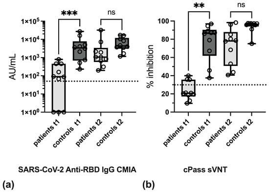 In a further step, it was investigated whether qualitative classification of sera into reactive and non-reactive categories in the respective assays was sufficient to characterize the antibody response in patient and control sera and to highlight differences between both groups. To this end, cut-off values as suggested by the assays’ manufacturers were applied in the CMIA (≥50 AU/mL) and cPass sVNT (≥30% inhibition). Cut-off values published earlier [34,40] were used for wt S pVNT (≥65% inhibition) and wt RBD sVNT (≥25% inhibition). Moreover, the present study investigated qualitative reactivity in assays employing variant-specific antigens. A cut-off value of ≥65% inhibition was used for BA.1 S pVNT [40]. Cut-off values of Alpha RBD, Beta RBD, Gamma RBD, and Delta RBD sVNTs were set to ≥25% inhibition and the cut-off value of BA.1 and BA.5 RBD sVNTs to ≥50% inhibition. The application of these cut-off values to differentiate between reactive and non-reactive categories revealed a lower vaccination-induced antibody response in IBD patients as compared to the control group both at t1 and, to a lesser extent, at t2 (Figure 7a).