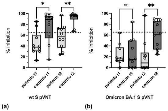 Determination of neutralizing antibodies against (a) wild-type S and (b) Omicron BA.1 S by pVNT. Boxes depict 25% to 75% percentiles, min. and max. values are given by whiskers, individual values are shown, the variable median is indicated by line. The significance of differences was determined by Kruskal–Wallis test and Dunn’s multiple comparison test. * p < 0.05, ** p < 0.01, ns: not significant. The cut-off value of the pVNT (≥65% inhibition) is indicated by dashed lines.