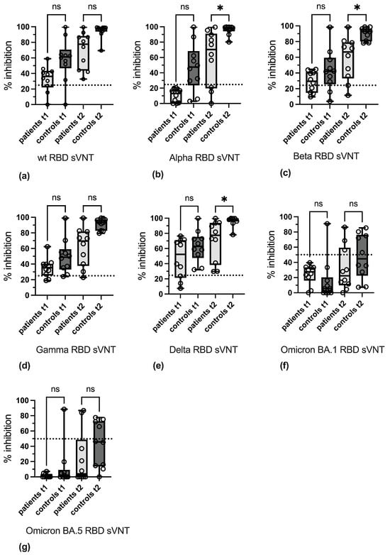 Determination of variant-specific inhibitory antibodies by in-house sVNT. Reactivity of patient and control sera with (a) wild-type RBD, (b) Alpha RBD, (c) Beta RBD, (d) Gamma RBD, (e) Delta RBD, (f) BA.1 Omicron RBD, and (g) BA.5 Omicron RBD is shown. Boxes depict 25 to 75% percentiles, individual values are indicated, whiskers give min. and max. values, and the variable median is indicated by line. Significance was determined with Kruskal–Wallis test and Dunn’s multiple comparison test. * p < 0.05, ns: not significant. The cut-off values of the sVNTs are indicated by dashed lines.