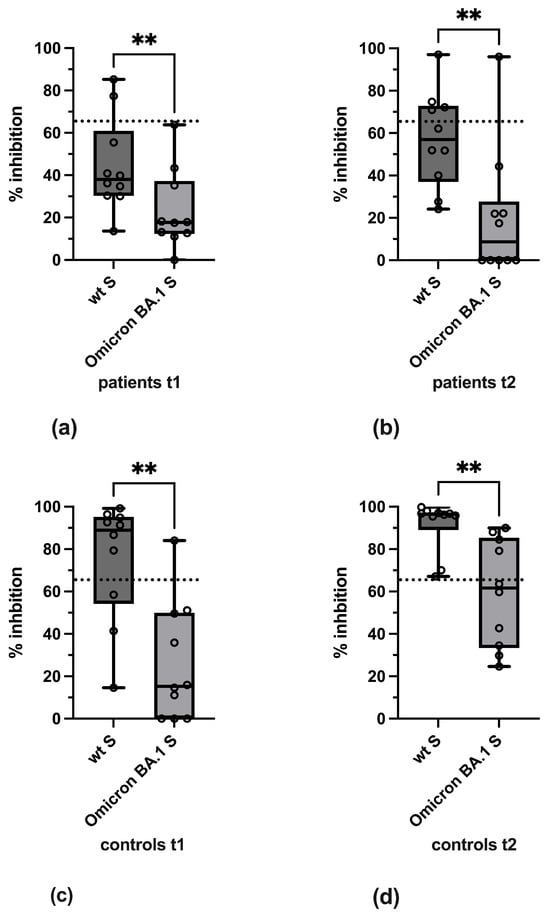 Pairwise comparison of neutralizing antibodies against wild-type S and BA.1 Omicron S by pVNT for (a) IBD patients at t1, (b) IBD patients at t2, (c) controls at t1, and (d) controls at t2. Boxes depict 25% to 75% percentiles, min. and max. values are given by whiskers, individual values are shown, the variable median is indicated by line. The significance of differences was determined by Wilcoxon test. ** p < 0.01. The cut-off value of the pVNT (≥65% inhibition) is indicated by dashed lines.