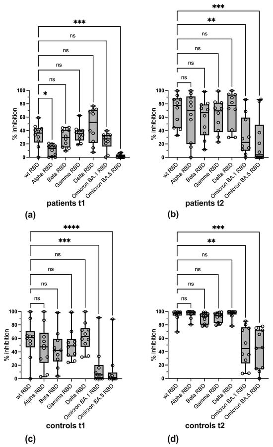 Pairwise comparison of wt and variant-specific reactivity in the in-house sVNTs revealed that in IBD patients, levels of inhibitory antibodies against the Alpha RBD and the BA.5 RBD were significantly lower at t1, whereas at t2, a significant decrease in antibody levels against the BA.1 RBD and BA.5 RBD was observed, with median levels below the cut-off value (Figure 6a,b). In control sera, levels of inhibitory antibodies against the BA.1 RBD and the BA.5 RBD were significantly reduced at both time points (Figure 6c,d).