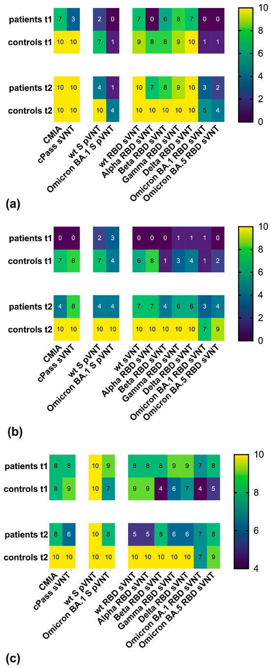 Qualitative differences in reactivity of IBD patients and the control group. The heatmaps display the number of sera (out of 10) reactive (a,b) in the respective assays at time points t1 and t2. In (a), the following cut-off values were used to categorize reactive and non-reactive sera: pVNT ≥ 65% inhibition, CMIA ≥ 50 AU/mL, cPass sVNT ≥ 30% inhibition; wt, Alpha, Beta, Gamma, Delta RBD in-house sVNTs ≥ 25% inhibition; BA.1 RBD sVNT and BA.5 RBD sVNT ≥ 50% inhibition. In (b), adapted cut-off values were used to differentiate between reactive and non-reactive sera: CMIA ≥ 1126 AU/mL, cPass sVNT: ≥49.4% inhibition, BA.1 S pVNT ≥ 20.09% inhibition, wt RBD sVNT ≥ 59.55% inhibition, Alpha RBD sVNT ≥ 25.35% inhibition, Beta RBD sVNT ≥ 72.27% inhibition, Gamma RBD sVNT ≥ 54.6% inhibition, Delta RBD sVNT ≥ 72.07% inhibition, BA.1 S RBD sVNT ≥ 34.73% inhibition, and BA.5 S RBD sVNT ≥ 9.095% inhibition. (c) The heat map displays the number of sera yielding results concordant with those of the wt S pVNT as the gold standard (true positive plus true negative results).
