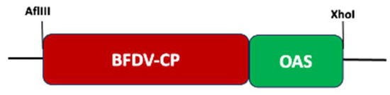 The BFDV CP gene sequence, isolate BKS1ZA_84 (Genbank accession number GQ165756) from budgerigars, was used to create BFDV-CP-OAS construct. The BFDV-CP and OAS sequences were amplified from their parental plasmids (pRIC3-BFDV-CP and pRIC4-EGFP-SARS-conc-OAS), fused into one fragment using assembly PCR and successfully ligated into replicating plant-expression vector (pRIC4) before transforming into E. coli and Agrobacterium competent cells, respectively (Figures S1 and S2).