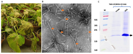 Expression confirmation of TMV rods encapsidating BFDV-CP-OAS mRNA. Images showing leaves that were harvested 7 dpi when they were very necrotic (A). TEM image showing TMV rods of various sizes, ranging from 50 to 350 nm (indicated by orange arrows). The expected TMV/BFDV-CP-OAS is approximately 89 nm in length. The scale bar is 100 nm. (B). Scale bar indicates 100 nm (B). Coomassie stained gel image of TMV-CP expression in N. benthamiana leaves harvested on 7 dpi (C). Crude: crude samples, PEG: 4% PEG-precipitated samples. PageRuler™ Prestained Protein Ladder Plus in kDa (Thermo Fisher Scientific). Black arrow indicates the size of TMV-CP, approximately 17.5 kDa.