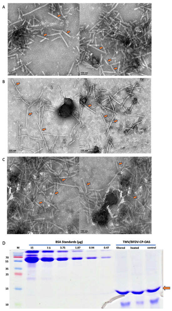 TEM analysis of TMV/BFDV-CP-OAS extractions prepared from leaf material harvested 7 dpi and purified using PEG precipitation. These are representative images indicating that neither filter-sterilisation or heat-treatment had any negative effects on the abundance and integrity of TMV rods. (A) filtered sample, (B) heated sample, (C) control sample. Arrows indicate sample TMV rods. Scale bar indicates 100 nm. (D) Quantification of TMV/BFDV-CP-OAS samples using BSA standards ranging from 15 to 0.47 µg. Samples were either filtered using 0.45 µM syringe filter (filtered), heated at 70 °C for 20 min (heated), or not treated at all (control). A band of approximately 15 kDA was observed in both the treated and control samples, as indicated by the orange arrow. M: PageRulerTM Prestained Protein Ladder Plus (Thermo Fischer Scientific).