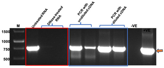 PCR using RNA (in red rectangle) and cDNA (in blue rectangle) samples as template. GeneRulerTM 1 kb DNA Ladder in bp (M), No template control (−VE), Plasmid DNA as control (+VE). RNA samples were treated with two different concentrations of DNase to evaluate the most effective concentration. First strand of cDNA was synthesised using both RNA treatments.