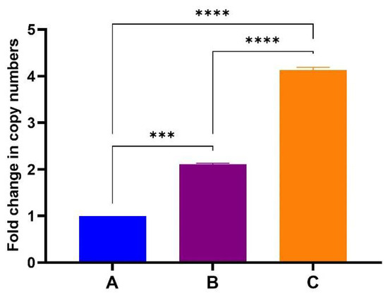 Fold change in BFDV-CP gene copy numbers between samples A, B and C. Average Cq values of two individual experiments in triplicates using RNA samples from a single extraction. The ΔΔCT method was used to quantify the differential expression of BFDV CP in samples B and C, using sample A as the reference control. Error bars represent standard error of means. The BFDV-CP mRNA copies obtained in sample B and C were statistically significantly higher (p = 0.0005 and p < 0.0001) compared to the control sample A (denoted by *** and ****). The mRNA copies in sample C were also significantly higher (p < 0.0001) compared to sample B (denoted by ****).