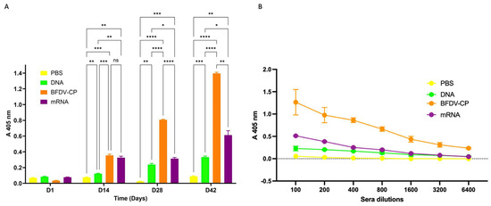 (A) Indirect ELISA assay analysing the immune response induced by sera samples from candidate vaccines and PBS control. Antigen: plant-purified BFDV-CP; primary antibody: pooled sera (DAY 1, 14, 28 and 42) from respective vaccine groups (1:100); secondary antibody: anti-bird (1:5000). Data represent averages from four individual experiments (plates) with four replicates in each experiment. Error bars represent standard error of means. Statistical significance was calculated using the two-way RM ANOVA and p-values were calculated based on Tukey’s multiple comparisons test with 95% Cl. Asterisk (*) denotes statistical significance. D14: All three vaccine candidate groups (DNA, BFDV-CP and mRNA) elicited statistically higher (p = 0.0074, p = 0.0007 and p = 0.0016) immune response compared to negative control (denoted by **, *** and ** respectively). BFDV-CP and mRNA vaccines induced statistically higher immune response (p = 0.0008 and p = 0.0024) compared to DNA vaccine (denoted by *** and ** respectively). There was no statistically significant difference (p = 0.6743, denoted by ns) between the immune response induced by BFDV-CP (A 405 nm = 0.354) and mRNA vaccine (A 405 nm = 0.325). D28: the three vaccines, DNA, BFDV-CP and mRNA maintained significantly higher (p = 0.0016, p < 0.0001 and p = 0.0008) immune responses compared to the PBS control (denoted by **, ****, and *** respectively). BFDV-CP and mRNA vaccines elicited 3.4- and 1.3-fold higher immune response (p < 0.0001 and p = 0.0458) compared to the DNA vaccine (denoted by **** and *), and BFDV-CP was 2.6-fold higher (p < 0.0001) compared to mRNA vaccine (denoted by ****). D42: DNA, BFDV-CP and mRNA vaccines still had a much higher immune response (p = 0.0001, p < 0.0001 and p = 0.0073) compared to PBS control (denoted by ***, **** and **). BFDV-CP and mRNA vaccine immune response had increased to 4.2- and 1.8-fold higher (p < 0.0001 and p = 0.0421) compared to DNA vaccine (denoted by **** and *), and BFDV-CP was 2.3-fold higher (p = 0.0016) than mRNA vaccine (denoted by **). (B) Titrations of sera from four vaccine groups: PBS (negative control), DNA, BFDV-CP and mRNA group. Antigen: plant-purified BFDV-CP; primary antibody: pooled sera (DAY 1, 14, 28 and 42) from respective vaccine groups (1:100–1:6400); secondary antibody: anti-bird (1:5000). Data represent averages from two individual experiments (plates) with three replicates in each experiment. Error bars represent standard error of means.