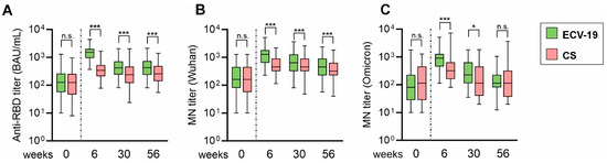 When anti-RBD titers at weeks 30 and 56 were compared with those at week 0 (pre-vaccination) within a group, the week 30 and 56 titers remained significantly higher than week 0 titers both for ECV-19 and CS groups (Supporting Table S3). Similarly, Wu-MN titers were significantly higher at weeks 30 and 56 compared to those at week 0 for both groups. On the other hand, MN titers against the Omicron strain (Om-MN titers) went back to the pre-vaccination levels at week 30 in CS group (p > 0.999), and at week 56 (p > 0.999) in ECV-19 group. In the ECV-19 group, the week 30 Om-MN titer was significantly higher than week 0 titer, p < 0.001.