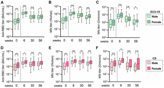 Effect of sex on humoral immune responses. The data presented in Figure 1 were divided by sex. For anti-RBD titers and MN titers against Wuhan, data from 252 males and 278 females were analyzed for ECV-19 group (A,B), and those from 152 males and 106 females for CS group (D,E). For MN titers against Omicron, data from 30 males and 33 females were analyzed for ECV-19 group (C), and those from 19 males and 7 females for CS group (F). Box plots (25/50/75 percentiles) and 2.5/97.5 percentiles (error bars) are shown. The difference between males and females at each time point was assessed by a Mann–Whitney test. *** p < 0.001; ** p < 0.01; * p < 0.05; n.s., not significant.