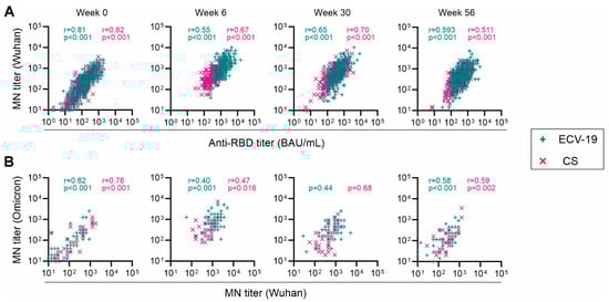 Next, we evaluated associations among the immunological readouts within this study. Consistent with our previous observations [11], there were strong correlations between anti-RBD titers and Wu-MN titers throughout the study for both ECV-19 and CS groups (p < 0.001 and Spearman’s rank correlation coefficients, r, were >0.5 for both groups; Figure 3A). Significant correlations between Wu-MN titers and Om-MN titers were also observed, except for Week 30 (Figure 3B).