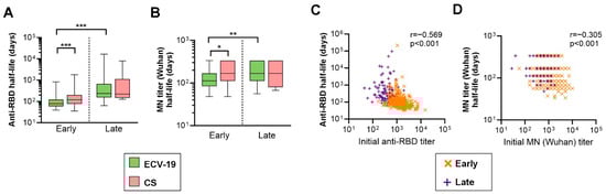 Antibody half-life during early and late decay period. For individuals who showed decrease in titers over time, half-life of anti-RBD titer (A) and anti-MN (Wuhan) titer (B) were calculated during 6–30 weeks (early) or during 30–56 weeks (late) decay period using an exponential decay model. The numbers of individuals used for the analysis were 352 (ECV-19 early), 100 (ECV-19 late), 115 (CS early), and 10 (CS late). A significant difference was examined by a Kruskal–Wallis test followed by Dunn’s multiple comparisons test.*** p < 0.001; ** p < 0.01; * p < 0.05. (C,D) The correlation between initial titer (titers at week 6 for early decay half-life data, and those at week 30 for late decay half-life data) and the corresponding half-life was evaluated for ECV-19 group (a total of 467 data points in each panel). Spearman’s rank p-value and correlation coefficient (r) are shown in each panel by combining early and late decay data. The same plots for CS group are shown in Figure S2.