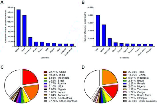 Cervical cancer incidence and mortality statistics for 2022. Data were compiled from surveillance reports by the World Health Organization (WHO) and the World Cancer Research Fund (accessed on 2 June 2025). Data represent the female population, as cervical cancer is a sex-specific malignancy that occurs exclusively in individuals with a cervix. (A) The top 10 countries with the highest cervical cancer incidence rates, along with their corresponding case numbers. (B) The top 10 countries with the highest cervical cancer mortality rates, along with their associated death counts. (C) Global distribution of cervical cancer incidence rates by country. (D) Global distribution of cervical cancer mortality rates by country. Data presented in (C,D) are expressed as the percentage of cases by country, calculated as percentage of cases = 100 × (number of cases/total number of cases reported globally). Other countries include all reported countries (175 countries) except the top 10. The pie charts were generated using GraphPad Prism 10.3.1 software.