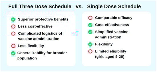 Adopting a single-dose HPV vaccination schedule in China could be a cost-effective and operationally feasible way to optimize vaccine allocation and improve vaccine coverage (Figure 2). Modeling studies indicate that a single-dose regimen would be the most cost-efficient option, while the three-dose nine-valent HPV vaccine regimen would maximize benefits if vaccine costs were halved []. Even under conservative assumptions of 30 years of protection from a single dose, most cervical cancer cases could still be averted, making the single-dose strategy both practical and cost-saving []. Catch-up vaccination for older cohorts under this schedule has also been shown to enhance cost-effectiveness. For instance, reallocating the second dose to vaccinate 20-year-olds would lead to net savings of 4.1–6 billion while maximizing the program’s efficiency []. Operationally, a single-dose schedule simplifies vaccination logistics and reduces the burden on healthcare delivery systems, thereby improving accessibility and accelerating coverage expansion []. HPV vaccine coverage in China remains relatively low. As of 2022, the first-dose coverage rate was only 10.15%, significantly below global averages and far from sufficient to achieve the goal of cervical cancer elimination []. Shifting to a single-dose schedule could mitigate supply constraints, enabling more rapid achievement of high coverage rates essential for population-level protection. At the same time, the flexibility afforded by single-dose scheduling allows greater adaptability in national immunization strategies, such as supporting gender-neutral vaccination or reserving multi-dose regimens for immunocompromised populations.