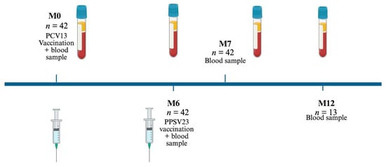 Study design. All patients sequentially receive a single dose of PCV13 and PPSV23. Blood samples are drawn at the indicated time points.