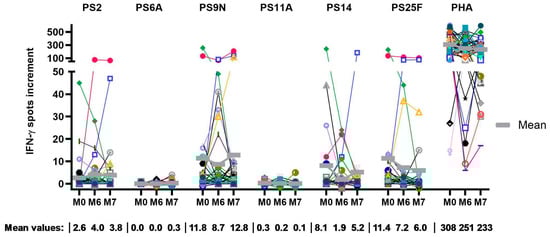 By calculating the IFN-γ spots increment, the mean spot formation over the time course was determined, and the highest response was observed for PS9N, PS14, and PS25F (Figure 2). A subgroup of patients even showed spots increment exceeding 100. Despite PS6A being unique to PCV13, an increase in cellular responses could not be observed, as the mean spot formation remained almost undetectable at all three time points. For the serotypes covered by PPSV23, PS9N induced a minor increase in cellular responses, with a mean spot increment of 8.6 before application of PPSV23 and a mean spot increment of 12.8 at month 7 (1.5-fold increase). Similarly, PS2 stimulation led to a minor change in mean spot increment (2.6 at baseline to 3.8 at month 7). The median values indicated that more than half of the patients showed no or a very minor response; i.e., the result was between 0 and 2.5 spot increment at all time points (Table 2 and Figure 2).