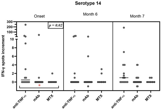 Therapy-specific cellular ELISpot response to serotype 14 over the course of surveillance. To assess each of the ELISpot responses, mean values of triplicate cultures (with antigen concentrations of 100, 150, and 200 μg/mL) are considered. Therapy regimens include TNF-alpha-blockers (n = 14), monoclonal antibodies (IL-12/23, IL-23, and IL-17-blockers) (n = 21), and methotrexate (n = 7). Mean values of each treatment group are shown as horizontal lines. Data are compared by the Kruskal–Wallis test, followed by Dunn’s multiple comparison test. Statistical significance is marked in the first column (Onset) for comparison of all three groups (* p = 0.02).