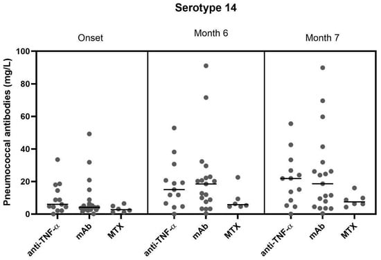 The impact of therapeutic regimens on ELISpot results was evaluated by the Kruskal–Wallis test, followed by Dunn’s multiple comparison test. Patients undergoing anti-TNF-alpha-blocker therapy (n = 14), monoclonal antibody therapy (specifically anti-IL-12/23, IL-23, and IL-17) (n = 21), and methotrexate therapy (n = 7) showed a significant difference at the onset of this study, when comparing the three groups (p = 0.02). However, responses to the serotype PS14 were not significantly higher in direct comparison for patients treated with TNF-alpha-blockers and MTX (p = >0.99) or TNF-alpha-blockers and monoclonal antibodies (p = 0.24) at onset. Subsequent comparisons at month 6 (p = 0.4) and month 7 (p = 0.7), however, did not demonstrate a significant impact of treatment on the vaccine response (Figure 3). Nevertheless, the TNF-alpha-treated cohort showed higher T-cell responses also at month 7. A rise in mean spot formation only occurred in patients under TNF-alpha-inhibitors from months 6 to 7 with a 3.5-fold increase. No significant differences were observed in the other cohorts and for the remaining serotypes