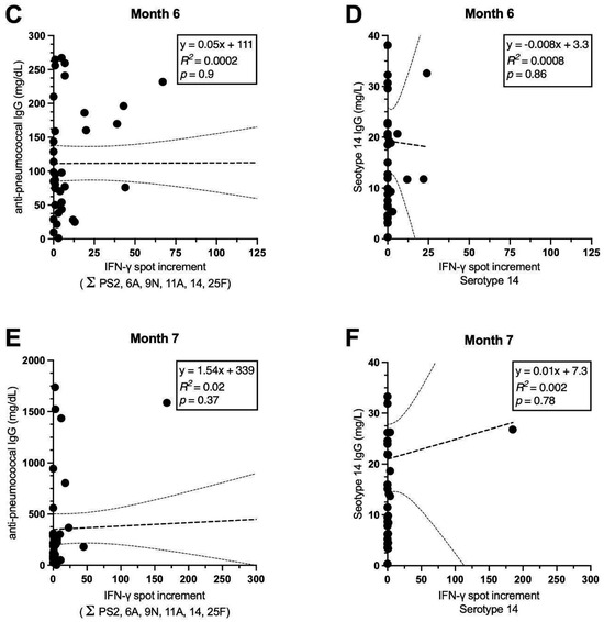 Spearman correlation analysis of the ELISpot measurements compared with IgG antibody production before and after vaccination with PCV13 and PPSV23 (n = 42). On the left side, IFN-γ spots are summed up for all studied serotypes on the x-axis. IgG antibody concentrations are displayed on the y-axis (A,C,E). On the right side, spots and IgG antibodies for PS14 are shown separately (B,D,F). To assess each of the ELISpot responses, median values of triplicate cultures (with antigen concentrations of 100, 150, and 200 μg/mL) are considered. The IgG antibody concentrations are measured by an IgG ELISA. The regression line is marked as a bold dashed line, while the thin dashed lines represent the 95% confidence interval.