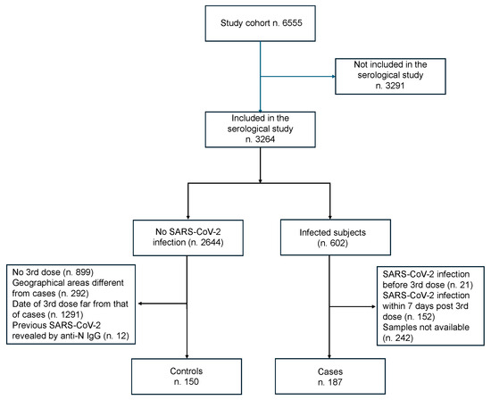 Out of 6555 enrolled patients included in the cohort study, 3264 subjects participated in the case–control serological study (602 SARS-CoV-2 infected and 2644 not infected). Included patients were enrolled in 67 clinical centers in 12 Italian regions, with a total of 15,997 blood samples collected at different time points. As shown in Figure 1, a total of 187 cases (infection from at least 7 days from the third dose) were selected (21 were excluded because of SARS-CoV-2 infection before the third dose, 152 because infection occurred within 7 days from the third dose of the vaccine, and 242 because their blood samples were not available). In total, 150 controls were selected (899 were excluded because they did not have the third dose; 292 were excluded due to being in geographical areas different from those of the cases; 1291 were excluded for having a third dose far from the corresponding date of cases; and 12 were excluded because a previous SARS-CoV-2 infection was revealed by anti-N IgG).
