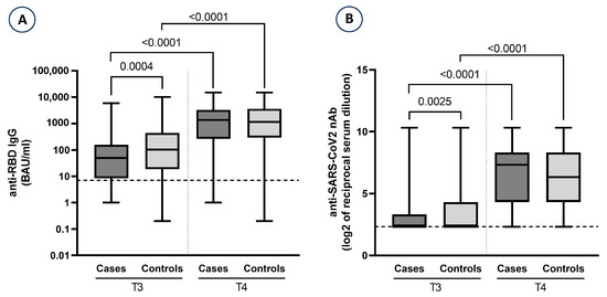 The anti-S/RBD-IgG titer reflects the magnitude of the antibody response to the vaccine, and nAb titers measure functional immunity to SARS-CoV-2. We observed a statistically significant increase (p < 0.001) from T3 to T4 of anti-S/RBD-IgG and nAb levels in both groups (Figure 2). As shown in Table 2, the median level of anti-S/RBD-IgG was lower in cases with respect to controls at T3 (immediately preceding the administration of the third dose of vaccine) (49.6 vs. 102.1; p = 0.0004), while very similar at T4 (1363.9 vs. 1142.6; p = 0.9527). Also, nAb levels (expressed as log2) showed the same trend (Table 1).