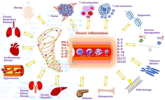 A schematic illustrating chronic inflammation as a central hub bridging metabolic, inflammatory, and immunological disorders. Chronic inflammation acts as a central mediator, bidirectionally interacting with diseases (obesity, chronic respiratory diseases, cardiovascular disease, hypertension, chronic kidney disease, chronic hepatitis, diabetes, osteoporosis, and tumors) and triggering immunological/molecular alterations (T-cell exhaustion, senescence, epigenetic changes, Th1/Th2 imbalance, telomere attrition, and DNA damage). Key inflammatory factors are categorized into Th1–associated proinflammatory cytokines (IFN–γ, TNF–α, IL–2, IL–12, IL–18, and IL–27) and Th2–regulatory subsets (IL–4, IL–5, IL–6, IL–9, IL–10, IL–13, CCL17, and CCL22), which orchestrate pathological interactions. Note: Arrows in the figure are presented in one–way/two–way forms to indicate the strength of causal relationships or feedback regulation in basic research and clinical findings, and the node size reflects its biological status.