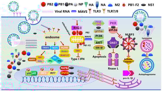 Influenza virus gene products (PB2, PB1, PB1-F2, PA, PA-x, HA, NP, NA, M1, M2, and NS1) contribute to viral infection and cytokine storms through multi-dimensional mechanisms (Figure 2) []: