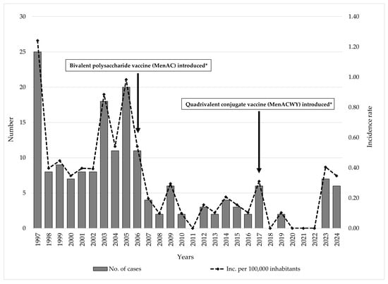 Trend of meningococcal disease and timeline of vaccine introduction against meningococcal disease in AP Vojvodina, Serbia, 1997–2024. Legend: * Mandatory for high-risk groups and international travelers.