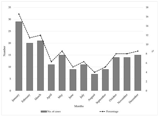From 1997 to 2024, IMD in AP Vojvodina showed a seasonal pattern, with most cases reported in January (17%), March (12%), and February (11%). The lowest percentage of cases were observed during the summer months, particularly in August (4%), June and September (5% each), suggesting a winter-spring peak in registered cases (Figure 2).