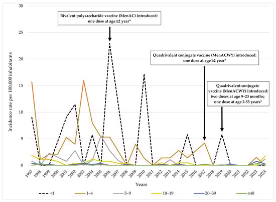 Age-specific incidence rates of meningococcal disease and timeline of vaccine introduction by target age groups in AP Vojvodina, Serbia, 1997–2024. Legend: * Mandatory for high-risk groups and international travelers.