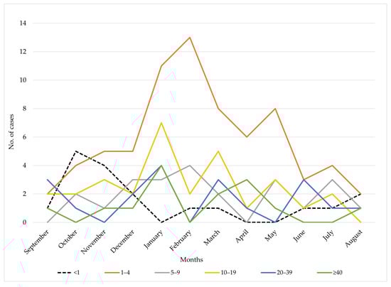 During the study period, infants <1 year of age (n = 18) had most cases in October (n = 5; 27.8%) and November (n = 4; 22.2%). Children aged 1–4 years accounted for the largest share of cases most months, peaking in January (n = 11; 15.5%), February (n = 13; 18.3%), and March (n = 8; 11.3%) out of 71 total cases. Cases among 5–9-year-olds (n = 23) were relatively stable year-round, with a slight peak in February (n = 4; 17.4%). The 10–19 age group (n = 30) peaked in January (n = 7; 23.3%) and March (n = 5; 16.7%). Adults 20–39 years (n = 19) were most affected in January (n = 4; 21.1%) and March (n = 3; 15.8%). Patients aged ≥40 years (n = 14) had highest case counts in January (n = 4; 28.6%) and April (n = 3; 21.4%), with no cases reported in February, June, July, or October (Figure 4).