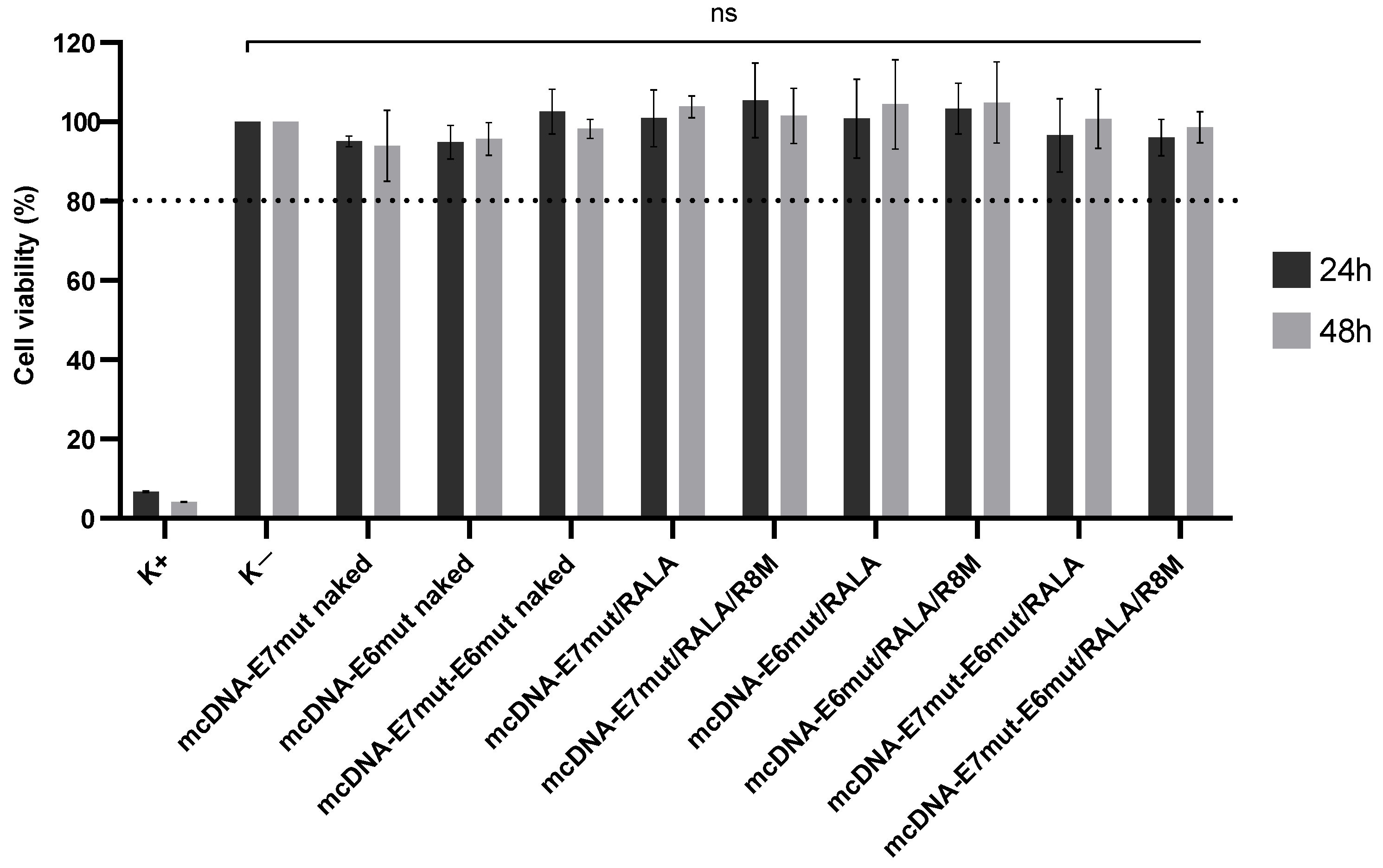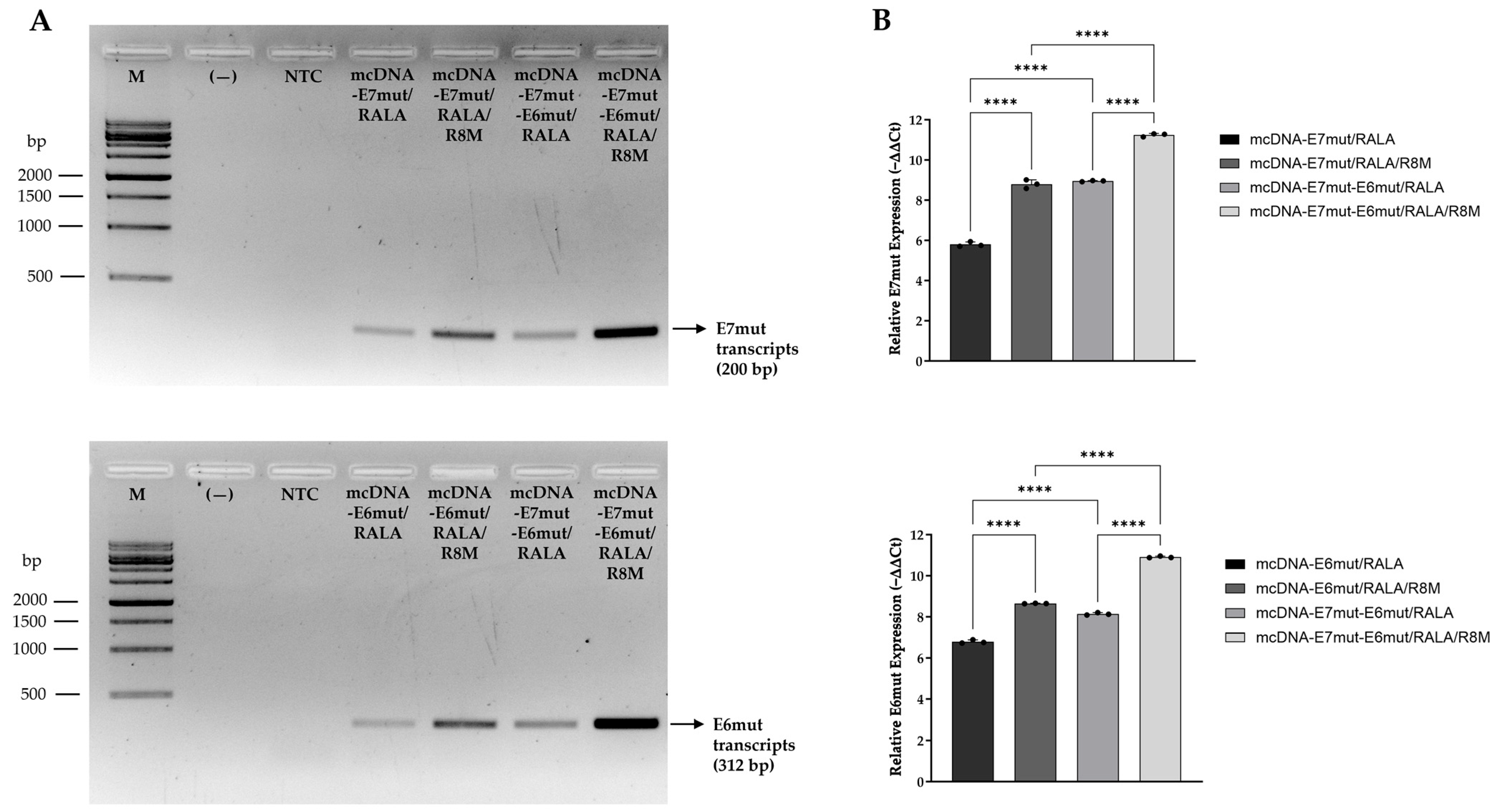 | 5 | mcDNA E7mut-E6mut | No | 106.73 ± 12.07 | 0.29 ± 0.03 | −13.25 ± 2.88 | 99.4 ± 0.23 |