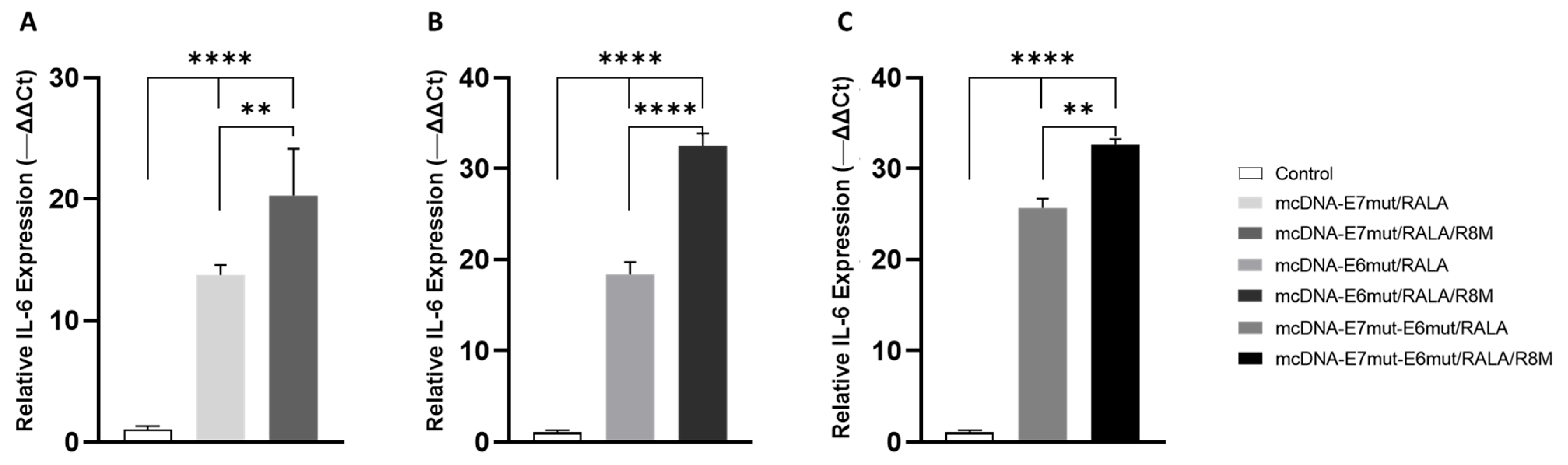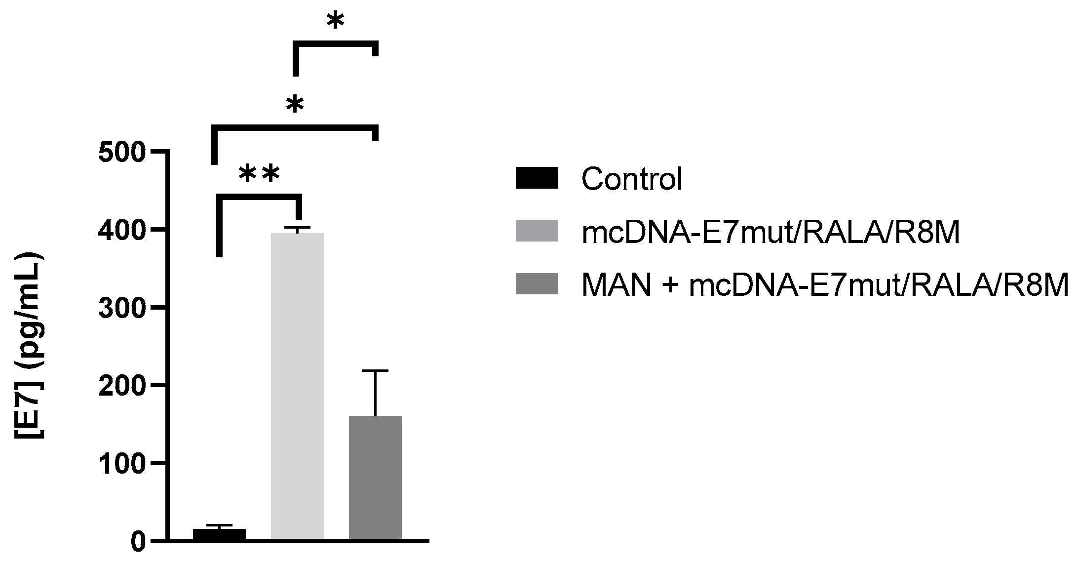 3.6. Evaluation of E7 Protein Levels and Mannose-Receptor Mediated Uptake