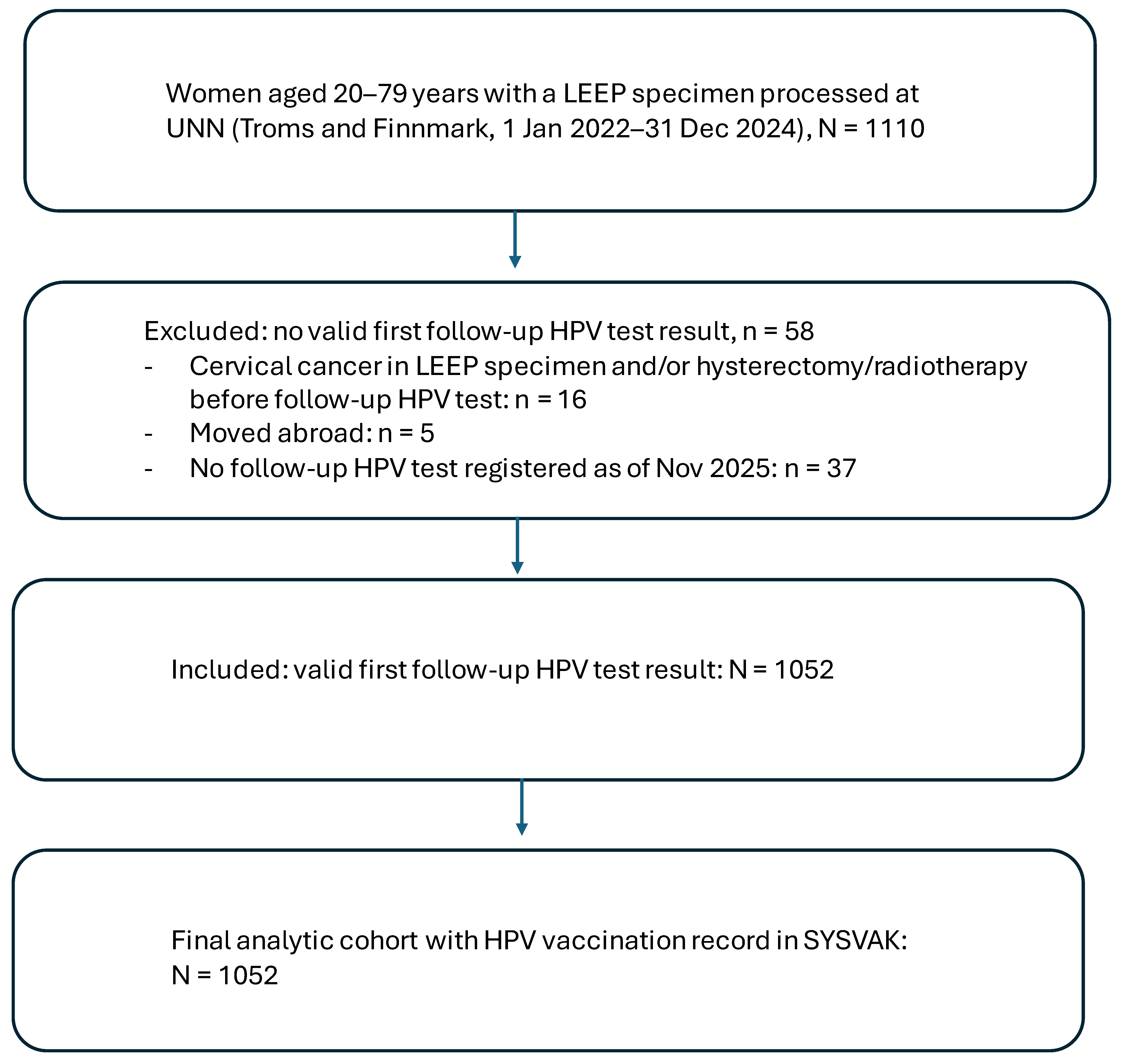 n = 1110), identified in SymPathy. According to Norwegian guidelines, the first post-treatment follow-up after LEEP is recommended at approximately 6 months. At UNN, a local reminder system is used; if the recommended follow-up test is not registered within 3 months after the scheduled follow-up time, reminders are sent to the responsible gynecologist and/or general practitioner. For the present study, women were eligible for inclusion if they had (i) a registered first post-treatment follow-up HPV test result in SymPathy (coded as negative or positive) and (ii) a recorded HPV vaccination status in the national immunization register (SYSVAK). Women without a valid follow-up HPV test result were excluded (