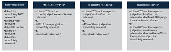 To define the strength of indication for PrEP, the analytic hierarchy process (AHP)—a multi-criteria decision-making method used to structure complex problems and make informed decisions—was used [22]. The AHP involved the expert panel guided by a methodologist (MM) who delivered and analyzed three online anonymous questionnaires using a modified Delphi technique. The members of the panel first ranked eight clinical outcomes of SARS-CoV-2 prophylaxis and selected the three most important ones. Subsequently, the panel listed 80 risk classes defined by host–disease–therapy combinations. In a subsequent round, the members of the panel ranked how much the critical SARS-CoV-2 prophylaxis outcomes were relevant in each of the risk classes. The relevancy of SARS-CoV-2 prophylaxis was judged using a 5-level Likert scale and an equivalent “relevance score” ranging from 1 to 5. The portion of panelists judging COVID-19 PrEP as “relevant” or “absolutely relevant” was calculated for each of the 80 risk classes. Additionally, a “standardized ratio” (sr) between the arithmetic mean and the standard deviation was estimated. Based on these estimations of clinical relevance, the expert panel agreed to classify patients into three major risk classes (Figure 1). The highest-ranked class included those conditions achieving an sr higher than 5 and scored clinically relevant by more than 75% and absolutely relevant by more than 40% of the panelists.